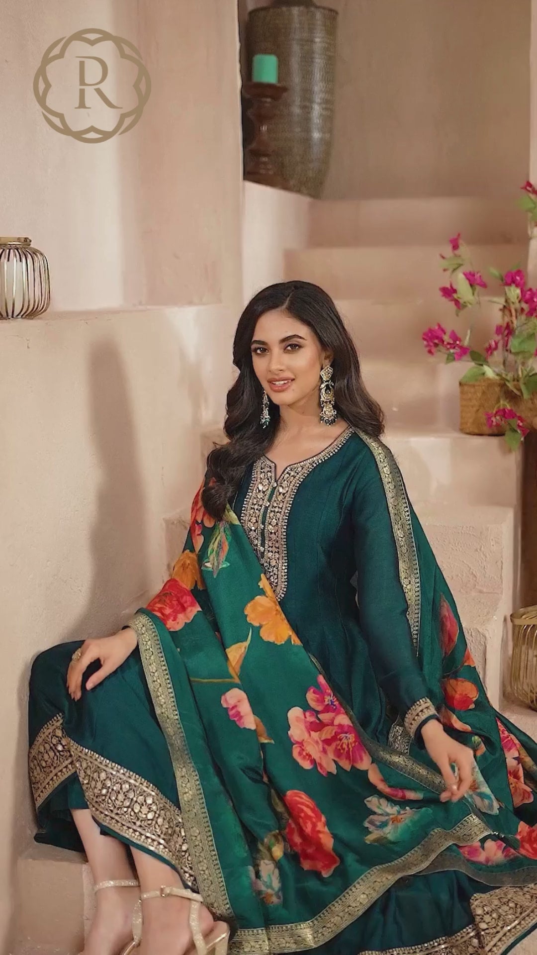 exquisite Mishka silk suit, where traditional craftsmanship meets contemporary elegance. The flair silhouette drapes gracefully, while intricate zari embroidery work adorns the ensemble with timeless sophistication. Paired with a beautifully printed dupatta.